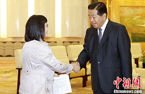 4月15日,中共中央政治局常委、全国政协主席贾庆林在北京人民大会堂会见了出席“2011海峡两岸工会论坛”的台湾工会界主要代表。中新社发 盛佳鹏 摄