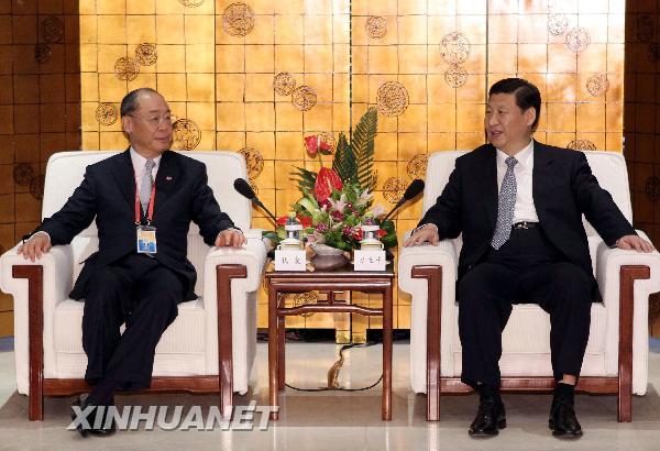 4月10日,国家副主席习近平在海南省博鳌会见出席博鳌亚洲论坛2010年年会的台湾两岸共同市场基金会最高顾问钱复。 新华社记者樊如钧摄