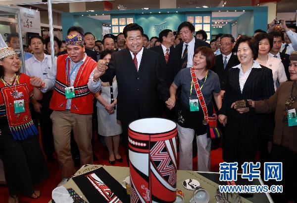 6月19日,中共中央政治局常委、全国政协主席贾庆林在福建省厦门市参观第三届海峡两岸文化产业博览交易会展馆。这是贾庆林在台湾少数民族工艺品展区和身着民族服装的台湾少数民族同胞手拉手跳起欢快的舞蹈。 新华社记者 庞兴雷 摄