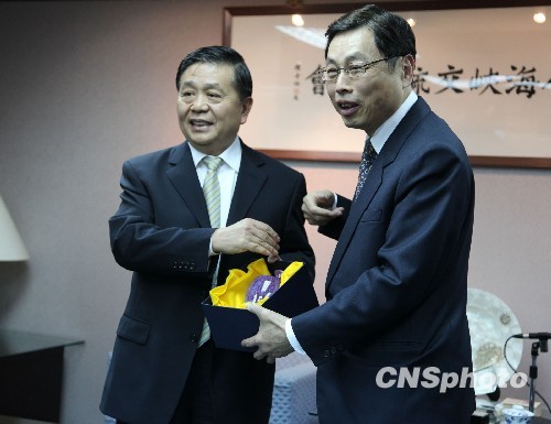由海协会副会长王富卿率领的海协会民族暨宗教交流访问团一行3月18日抵达台北。图为王富卿(左)一行18日晚前往海基会拜访,受到海基会副董事长兼秘书长高孔廉(右)的接待,高孔廉向王富卿赠送一只仿宋钧窑瓷瓶。 中新社发 耿军 摄