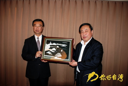 阎启俊书记向高雄市庄启旺议长赠送工艺品(你好台湾网 图)