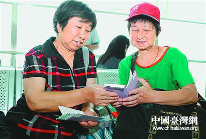 6月21日,两位旅客在查看赴台湾花莲包机机票。(图片来源:济南市台办)
