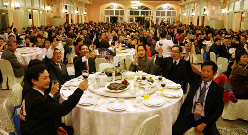 由国旅集团组成的千人陆客团,29日抵达苗栗县进行晚宴,团员一同举杯,准备迎接在台的倒数跨年夜。