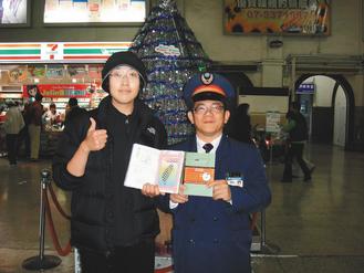 来自北京的交换学生傅超(左)台南站集满百戳,与台南站长陈荣彬合影。图片来源:台湾《联合报》