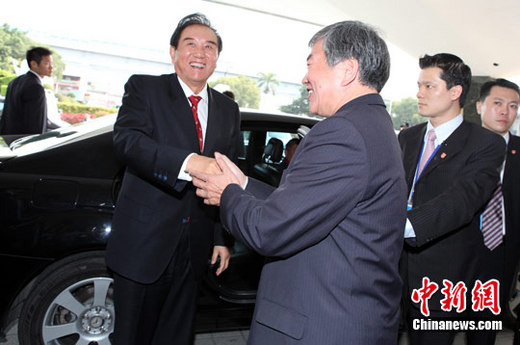 2月24日,海协会会长陈云林跨越浊水溪进行在台湾中南部的经贸考察之旅,他形容首次到高雄,心情很激动。图为当天下午,陈云林乘车来到楠梓出口加工区参观,受到热情欢迎。中新社记者 董会峰 摄