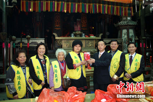 台湾宜兰关帝信众朝圣团团长林献忠及团员分别向东山关帝庙管委会赠送牌匾和世博天灯