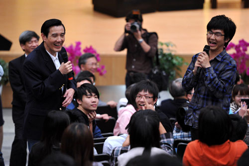 马英九还问学生对陆生来台政策的看法,有学生说“欢迎”,因为陆生跟台生相处融洽,获得马英九称赞。