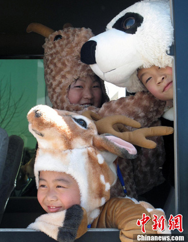 16日上午,威海小朋友来到当地机场迎候台湾梅花鹿和长鬃山羊,她们将穿着羊与鹿以及大熊猫样式的服装表演舞蹈。这三种珍贵的动物今起将一同生活在刘公岛国家森林公园。刘舒凌 摄
