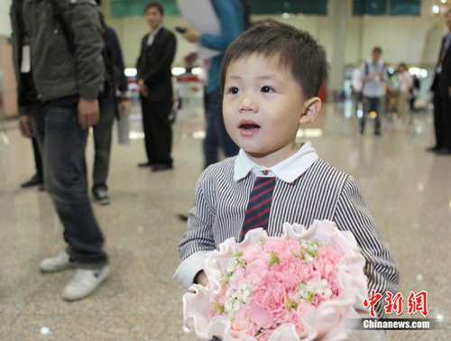 2011年5月2日,大陆著名歌唱家宋祖英抵达台北,将于5月8日在台北小巨蛋举行“宋祖英2011台北小巨蛋演唱会”,并与台湾歌手周杰伦、周华健同台演出。图为在机场等待宋祖英到来的小“粉丝”。中新社发 路梅 摄
