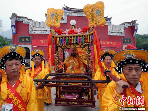 6月1日,应澎湖县县长王乾发、澎湖县王氏宗亲理事会盛邀,福州市晋安闽台王审知研究会访问团一行76人,在福州莲花山闽王纪念馆举行隆重起驾仪式,护驾闽王金身赴澎湖会香进行为期7天的交流访问。中新社发 刘可耕 摄