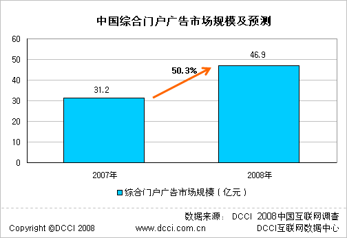 1月21日,DCCI互联网数据中心主办,中国互联网协会指导的2007-2008中国互联网市场数据发布会的《Netguide2008中国网络广告市场调查研究报告》显示:2007年中国综合门户广告市场规模为31.2亿元 DCCI预计2008年将增至约46.8亿元,增长率为50.3%。搜狐与新浪营收可能持平,腾讯增长速度最快,网易相对滞后,TOM.COM基本淡出,MSN中国门户、雅虎中国门户、中华网分食特定主题的细分市场。