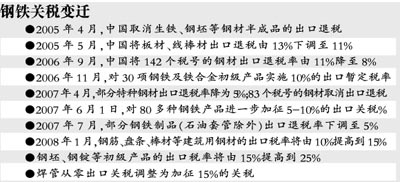“半个月以来几乎天天加班,希望能够把下个月要交货的量提到这个月完成。”浙江钢铁集团有限公司销售科的李磊在电话里对记者说。钢材企业突然手忙脚乱,与钢铁产品出口关税将在2008年后再次调整有直接关系。