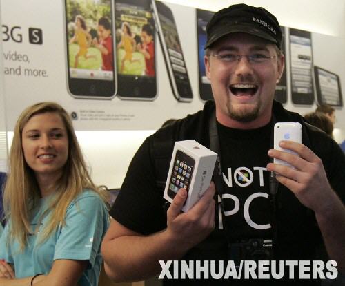 6月19日,在美国旧金山苹果公司专卖店,一名顾客兴奋地展示刚刚买到的iPhone 3GS手机。新华社/路透