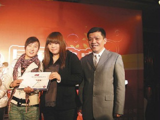85度C大陆分公司举办年终尾牙,董事长吴政学(右)专程飞到上海出席,并且颁奖表扬优秀员工。台湾《联合报》图