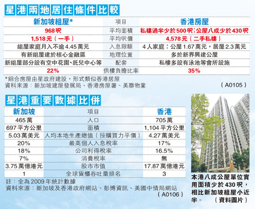 记者采访与香港同样地少人多的新加坡。约40年前,香港和新加坡同时起步,大规模建屋以解决城市居民住房问题;时至今日,香港的住屋平均面积比起星洲少一半,楼价却起码高出两三倍,更要住得远离市区。