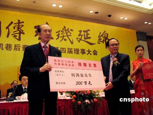 资料图:图为2008年11月,港澳知名人士何鸿燊(左)为一项基金捐赠人民币300万元。 中新社发 李凌 摄