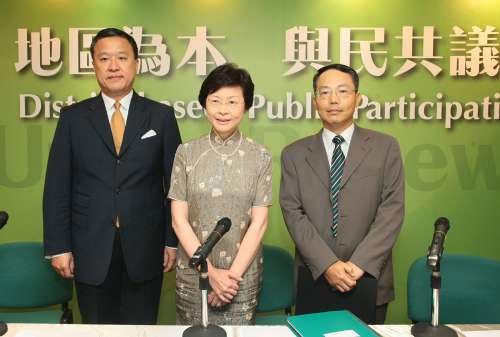 林郑月娥(中)说,市建局日后供应的单位,将以简约适中为主。图左为张震远、右为罗义坤。图片来源:大公报