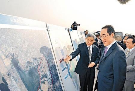 率领三十多名商界精英到前海考察的唐英年,听取前海现代服务业合作区介绍