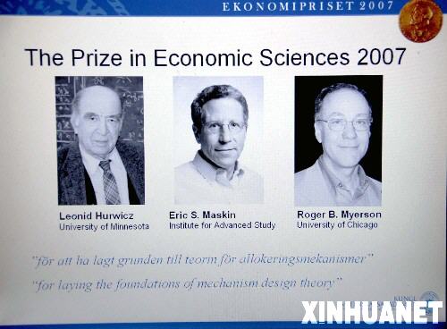 这张拍摄于10月15日的照片是显示获得2007年诺贝尔经济学奖的莱昂尼德·赫维奇、埃里克·马斯金和罗杰·迈尔森(由左至右)的电子屏幕。当天,瑞典皇家科学院宣布,将2007年诺贝尔经济学奖授予莱昂尼德·赫维奇、埃里克·马斯金和罗杰·迈尔森3名美国经济学家,以表彰他们在创立和发展“机制设计理论”方面所作的贡献。 新华社记者马世骏摄