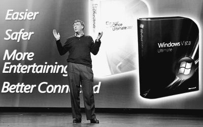 微软公司视窗Vista操作系统于1月30日开始向全球个人用户发售。图为微软公司董事长比尔·盖茨1月29日在美国纽约为视窗Vista操作系统的发售助阵。新华社发