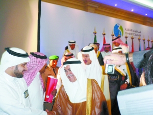 14日在新闻发布会开始前,沙特石油部长纳伊米受到媒体“围攻” 本报记者 朱周良 摄