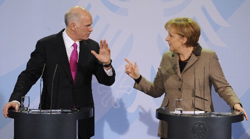 3月5日,德国总理默克尔(右)和到访的希腊总理帕潘德里欧在柏林出席新闻发布会。当日,帕潘德里欧到访德国并与默克尔举行会谈。鉴于德国在欧盟的巨大影响力,这次会见可能影响到欧盟应对希腊危机的政策走向。 新华社/法新