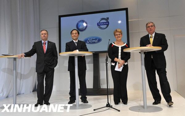 3月28日,在瑞典第二大城市哥德堡的沃尔沃公司总部,沃尔沃汽车公司首席执行官斯特芬·奥德尔、中国吉利汽车集团董事长李书福、瑞典副首相兼工业与能源大臣毛德·奥洛夫松、美国福特汽车公司首席财务官莱维斯·布思(从左至右)出席签约后的新闻发布会。中国浙江吉利控股集团有限公司当日与美国福特汽车公司在瑞典哥德堡正式签署收购沃尔沃汽车公司的协议。新华社记者武巍摄
