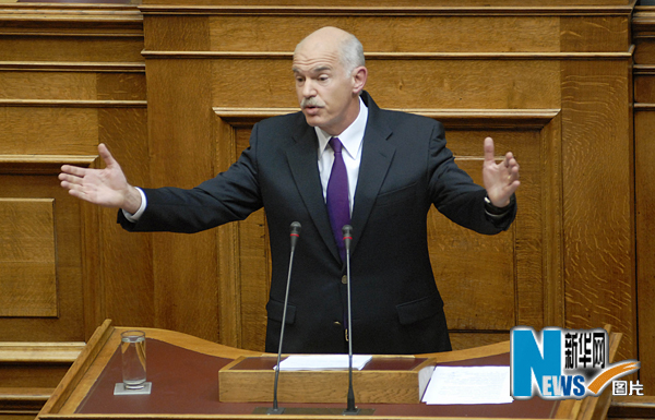 5月6日,在希腊首都雅典,希腊总理帕潘德里欧在议会发表讲话。当日,希腊议会经过激烈辩论,通过了帕潘德里欧政府提出的新紧缩措施,以换取欧盟和国际货币基金组织1100亿欧元的救助款。希腊政府需要实施严厉的紧缩政策,包括大幅削减公务员工资、增加税收以及在未来3年内削减财政预算300亿欧元,以便在2014年将财政赤字控制在国内生产总值的3%以内。新华社发