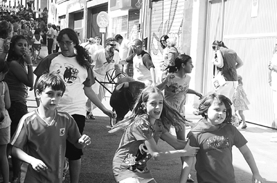 8月26日,圣塞巴斯蒂安·德·洛斯雷耶斯专为儿童举办了奔牛节。图为孩子们正在和人力控制的“奔牛”赛跑。 人民网记者 丁大伟摄