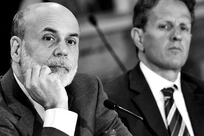 美联储主席伯南克(左)与财长盖特纳出席财政部会议。 图片来源:香港《文汇报》