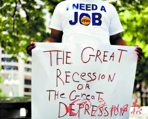 一失业者手持“经济大衰退或经济大萧条”牌子