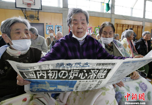 资料图: 北京时间3月11日13点46分,日本本州岛附近海域发生里氏9.0级地震,震中位于宫城县以东太平洋海域,此次地震海啸造成至少1万人下落不明,并引发了福岛县核电站爆炸。图为13日,福岛县爆炸的核电站附近居住的居民被转移到安全地带后,几位老人在看报纸。