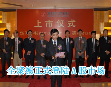 20日上午,北京市政府副秘书长王晓明与公司董事长姜俊贤在深圳证券交易所敲响开市宝钟。电视屏实时显示,开盘价36.81元,较其发行价11.39元上涨223.18%,因其开盘涨幅已超50%,9时30分全聚德被深交所临时停牌,9时46分复牌。一开盘就被临时停牌,全聚德创下了中小板上市首日临时停牌最快的记录。 [详细]