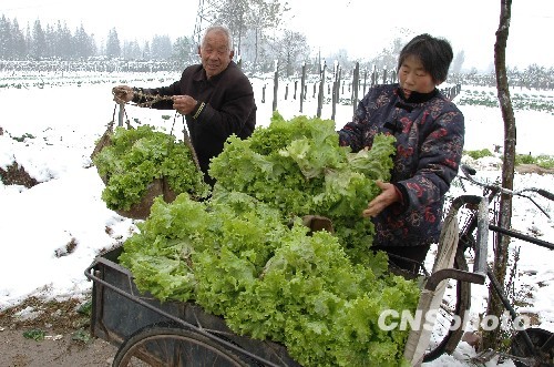 11月12日,河南南阳卧龙区白塔村“菜篮子”蔬菜供应基地,菜农雪中收割蔬菜,以保证市场蔬菜正常供应。 中新社发 熊运彬