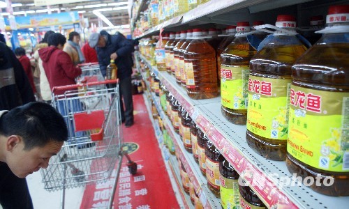 2009年12月6日,苏州市民在超市选购物品。近日,国内食用油开始新一轮涨价。苏州各市场食用油货源充足,市民购货秩序井然,大多数苏州市民表示,食用油调价对他们的生活影响不大。 中新社发 李俊锋 摄
