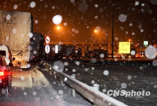 1月3日夜间至4日凌晨,众多车辆滞留在京沪高速至京津塘高速泗村店入口。当日,受强降雪和路面结冰影响,京承高速、京津高速、京津塘高速均采取道路封闭和分流措施。 中新社发 廖攀 摄