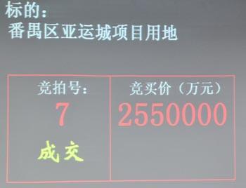 在短暂的静默与期待之后,富力联合体继续叫价,一举打破了业内心理关口,并引发全场鼓掌。在富力联合体将地价叫到255亿元的时候,保利联合体不再继续叫价。“255亿元第一次……255亿元第二次……255亿元第三次,成交!”伴随着一声响亮的棰声,亚运城项目在历时半个钟头经过47轮叫价之后被富力联合体竞得。
