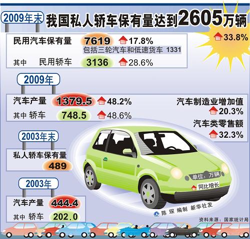 新华网北京2月25日电(记者刘铮)国家统计局25日发布的数据显示,2009年末全国私人轿车保有量为2605万辆,比上年末增长33.8%。