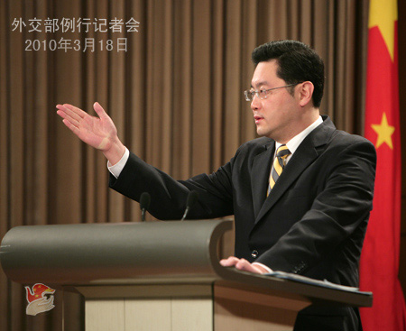 2010年3月18日,外交部发言人秦刚举行例行记者会。