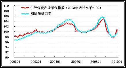 从中经煤炭产业景气指数走势图看,剔除随机因子和季节因子的景气指数明显低于仅剔除季节因子的景气指数,且上升趋势也较平缓,这在某种程度上表明煤炭产业仍依赖国家的扶持政策。