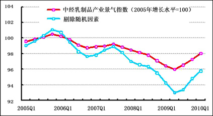 景气:一季度,中经乳制品产业①景气指数连续三个季度回暖,上升至98.1点(2005年增长水平=100②),比上季度提高0.8点,比上年同期上升1.6点。