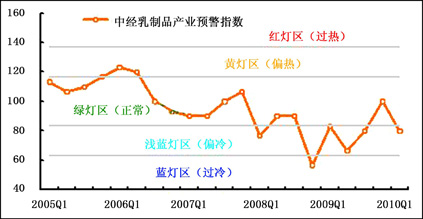2010年一季度,中经乳制品产业景气指数为98.1点(2005年增长水平=100),比上季度上升0.8点,比上年同期提高1.6点;中经乳制品产业预警指数为80.0点,比上季度下降20点,处于“浅蓝灯区”内运行。