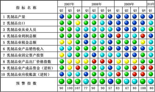 灯号:一季度,中经乳制品产业预警灯号为“浅蓝灯”。在构成中经乳制品产业预警指数的10个指标(仅剔除季节因素,保留随机因素)中,位于“红灯区”的有1个指标———产成品资金(逆转⑤);位于“绿灯区”的有3个指标———从业人员、产品出厂价格指数和应收账款(逆转);位于“浅蓝灯区”的有4个指标———出口额、税金总额、产品销售收入和固定资产投资,其中出口额和产品销售收入在连续五个季度处于“蓝灯区”后,本季度均有所好转,进入“浅蓝灯区”;位于“蓝灯区”的有2个指标———产量和利润总额。