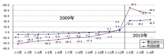 图1:2009年至2010年4月营业总收入、实现利润增幅变化情况(单位:%)