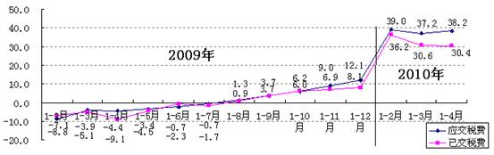 图2:2009年至2010年4月应交税费、已交税费增幅变化情况(单位:%)