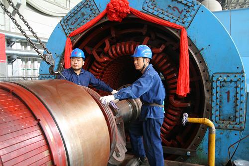 5月21日,工人们在大唐马头电厂拆除6号发电机组主要部件。 当日,大唐河北马头电厂将运行了30年的6号机组拆除,年可节约标准煤46万余吨,年削减二氧化硫排放8000余吨,年削减烟尘排放9000余吨。至此,该厂煤耗高、效率低、污染重的4台小火电机组全部关停。 新华社发(王九忠 摄)