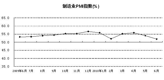 2010年6月,中国制造业采购经理指数(PMI)为52.1%,低于上月1.8个百分点,该指数已连续两个月出现回落,但仍位于临界点——50%以上。表明制造业经济总体继续保持增长态势,但在国家近期出台的宏观经济政策以及世界经济复苏步伐放慢等因素作用下,增速趋缓。