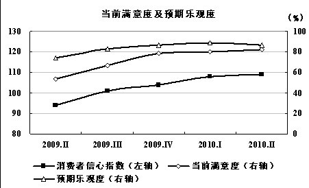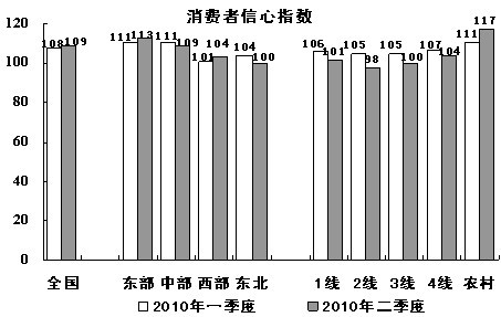 二季度农村消费者信心进一步增强,城市消费者信心有所回落。在去年以来持续大幅上升的基础上,二季度农村消费者信心又提高了6点,达到117。“上半年,一系列促进农业生产、农民增收的政策实施对农民信心的提升产生了一定的作用,很多省市最低工资水平的提高和农民工工资的增加增强了农民工对未来收入的乐观预期。” 国家统计局中国经济景气监测中心副主任潘建成说。
