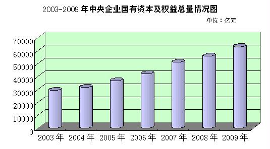 一、国有资产保值增值情况。2009年末,129家中央企业拥有国有资本及权益为62930.9亿元,比2009年初增加6987.4亿元,增幅为12.5%;比2003年增加3.4万亿元,年均递增13.7%。在本年国有资本及权益净增加额中,因国家追加投资、资本溢价、无偿划入等客观因素增加3508.8亿元,因无偿划出、自然灾害损失、上缴国有资本经营收益等客观因素减少1743.9亿元。扣除各项客观增减因素后,2009年中央企业平均国有资产保值增值率为109.3%。在全部中央企业中,2009年实现国有资产保值增值的企业有119家,占92.2%;国有资产保值增值率超过110%的企业有67家,占51.9%。