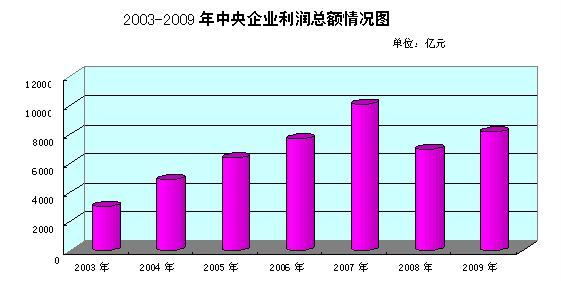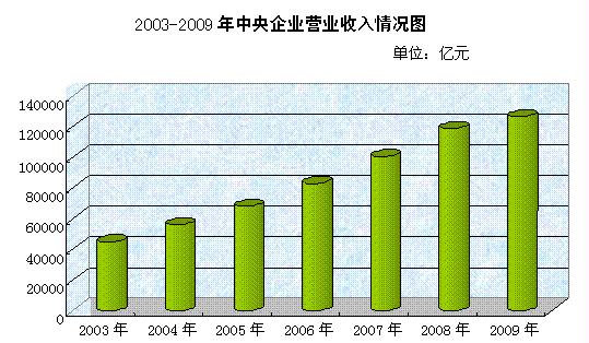 二、经营规模情况。截至2009年底,中央企业资产总额210580.8亿元,比上年增长19.5%;净资产总额83968.9亿元,比上年增长14.6%。2009年中央企业实现营业总收入126271.6亿元,比上年增长6.4%。在全部中央企业中,2009年底资产总额超过千亿元的企业有53家,比上年增加8家;2009年实现营业总收入超过千亿元的企业有38家,比上年增加5家。在美国《财富》杂志2010年公布的世界500强企业中,上榜的中央企业有30家,比上年增加6家,比2003年增加24家。